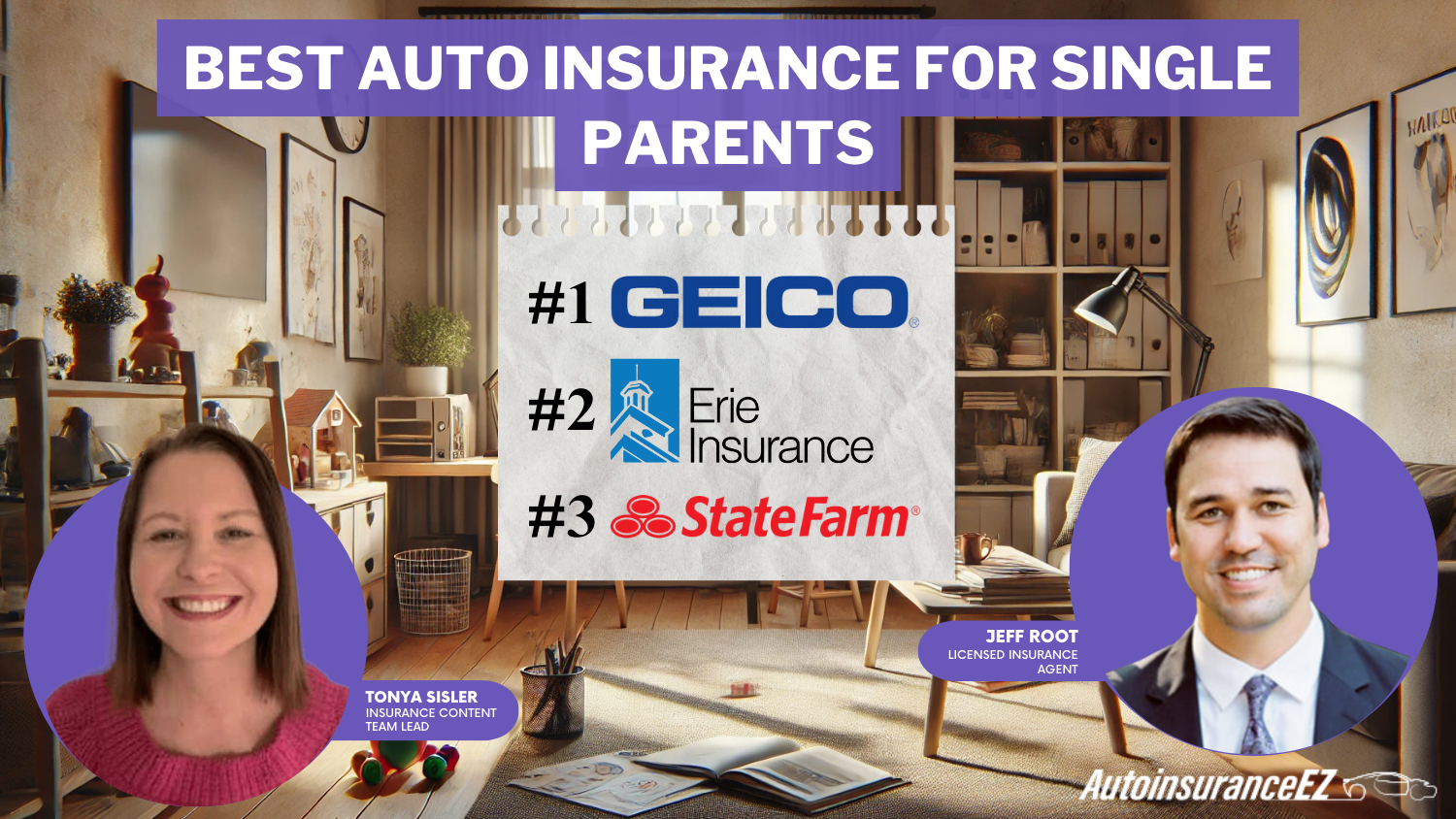 Find the best auto insurance for single parents with Geico, State Farm, and Erie, starting at $48 per month Geico is the top pick for low rates, State Farm is great for reliable service, and Erie is best for easy claims handling.Best Auto Insurance for Single Parents: Geico, State Farm, and Erie