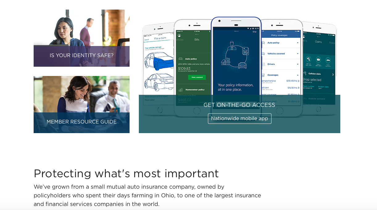 Nationwide’s website is well-designed and easy to navigate. At the top of the homepage, you can navigate to everything from various insurance products to account login to the claims page.